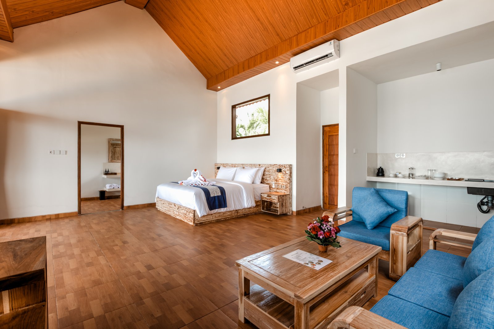 Elegant room at Seraya Cove Estate offering ocean views, modern comforts, and a peaceful atmosphere. Designed for relaxation with stylish interiors, natural light, and privacy—perfect for a serene tropical stay by the sea.